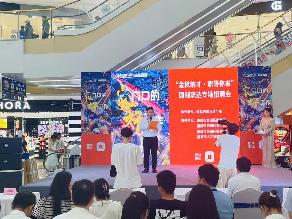 9月16日下午,由南昌市西湖区商务局、朝农街道、南昌万达广场商业管理有限公司承办,西湖区总工会、南昌市人才招聘网协办在南昌西湖万达广场举办了“金秋纳才·职等你来”即刻职达专场招聘会。