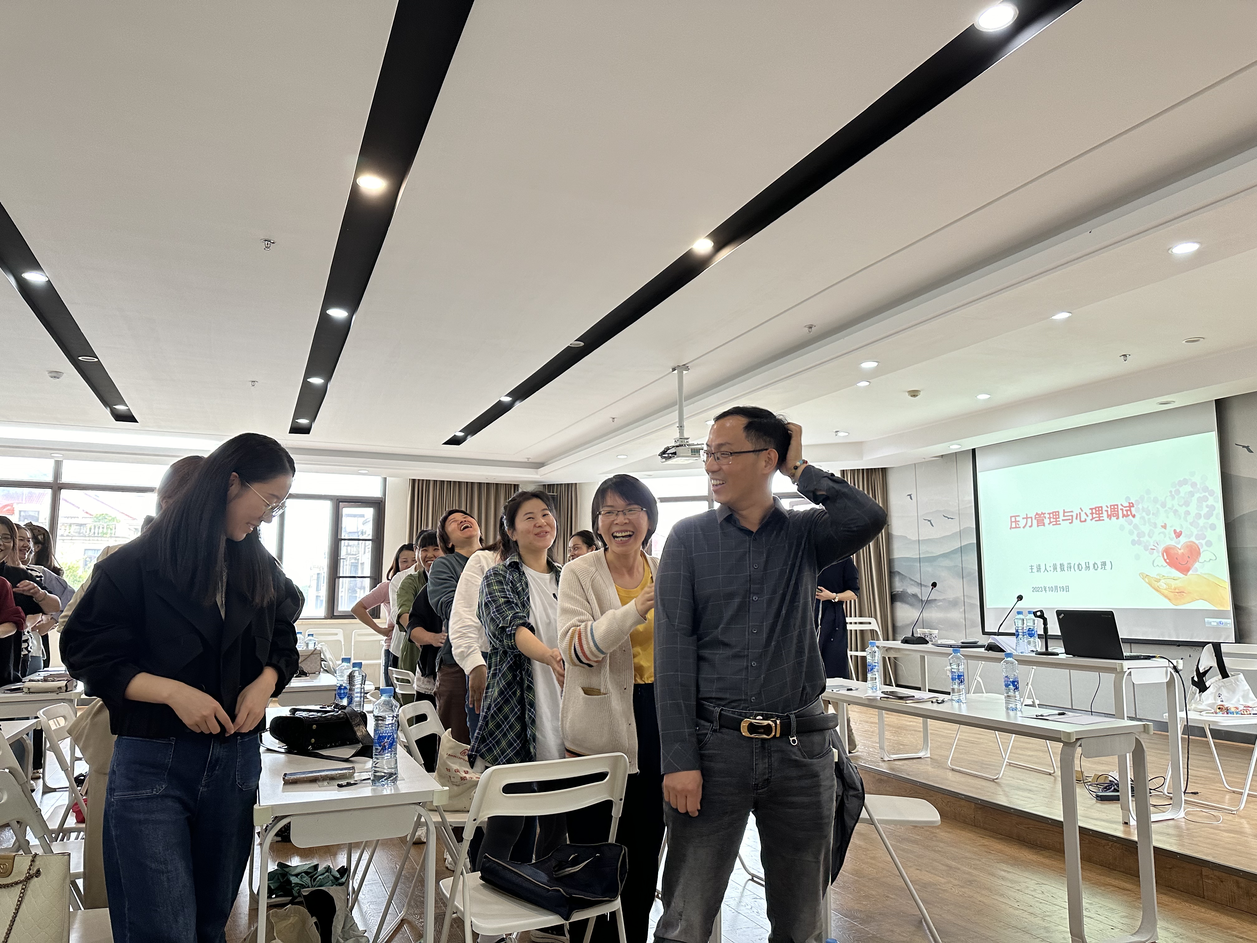 心理咨询师首先以“与压力和解”主题为切入点,通过一系列的解压游戏,进一步识别压力信号、提升压力管理能力,引导社区干部正确审视和评估自己的情绪,掌握积极心理暗示法并有效释放负面情绪和压力,对今后社区干部面向职工群众起到了积极的促进作用。