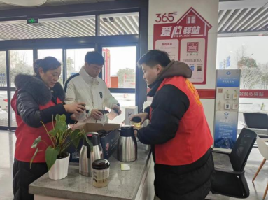 江西慧谷产业园工会“爱心驿站”为正在寒风中铲雪除冰的志愿者们送去热饮。