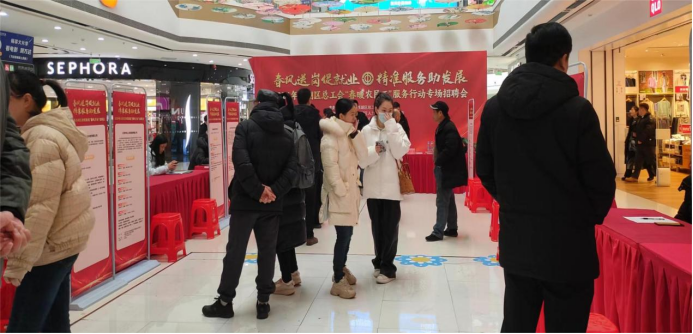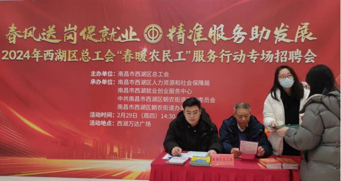 为落实市总关于招工稳工的部署要求,保障稳就业、保用工、促发展工作落实,有效缓解企业“招工难”,劳动者“就业难”问题,让“就业不用走他乡,西湖就是好地方”落到实处,近日,2024年西湖区总工会“春暖农民工”服务行动专场招聘会在西湖区西湖万达广场成功举办。