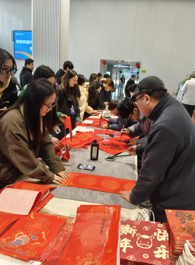 在华勤集团一厂、二厂,书法老师和企业职工书法爱好者一起挥毫泼墨,不少职工志愿者主动在现场服务,气氛热闹而有序。在联创电子公司,联创工会主席全程兴致盎然地和书法老师一起为职工书写春联,尽显工会“家”一般的温暖。在高新工人文化宫,活动吸引了附近龙旗、美晨、济民可信等20多家企业的职工到场,共送出春联300多副。