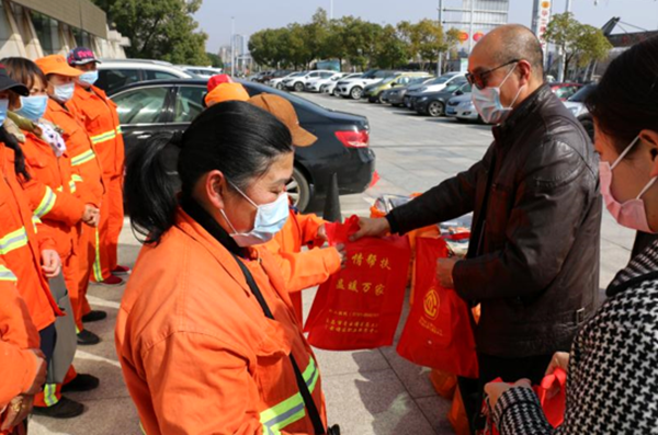 在迎接三八妇女节来临之际,2月22日下午,青云谱区总工会联合江西航旭贸易有限公司董事长、女企业家朱筱燕向长期奋战一线的部分女环卫工人代表进行捐赠活动。区人大常委会党组成员、副主任、区总工会主席万仁枚、常务副主席茅玮珊,女工委主席、副主席艾宙琦,区城管局相关负责同志参加了此次活动