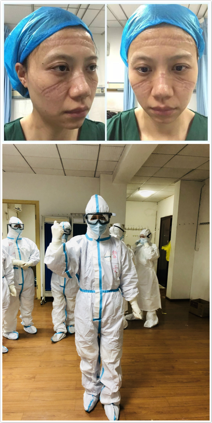 一个班下来,里面的衣服全湿透了,眼前一片模糊,感觉人都要虚脱了!下班脱下所有防护用品的那一刻,真是感觉一身轻松!大家看着自己脸上那些深深的、久久不能消失的勒痕,笑着说:“这是爱的痕迹,我们依旧很美丽!”