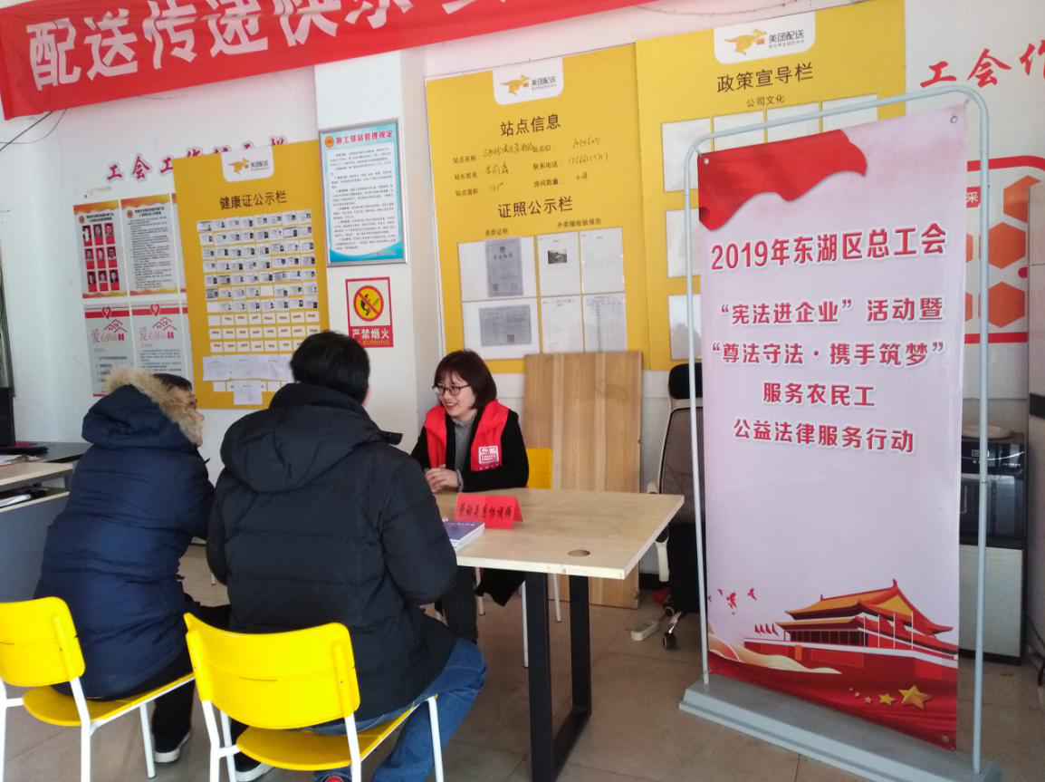 12月6日下午,东湖区总工会“三师”服务团队在我区樟树林快递外卖行业联合工会服务点举办“尊法守法 携手筑梦”服务农民工公益法律服务行动,为快递外卖小哥提供法律咨询服务。活动邀请了“三师”服务团队盈科律师事务所的公益律师,到现场为广大快递行业职工提供法律咨询服务,同时发放劳动合同法、女职工特别保护规定等法律宣传手册近100余份,得到了快递小哥的一致好评。