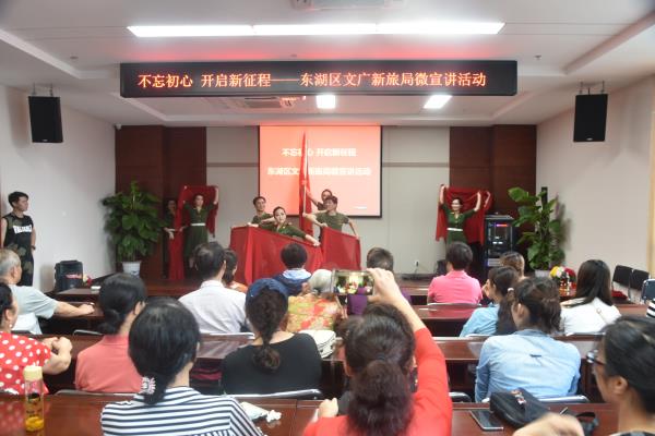 7月9日下午,东湖区文化系统党员干部、文化志愿者、下沙窝社区党员和居民群众(共驻共建社区)欢聚一堂, “不忘初心 开启新征程”东湖区文化馆微宣讲活动在这里举行,大家集中学习习近平总书记视察江西时的重要讲话精神。