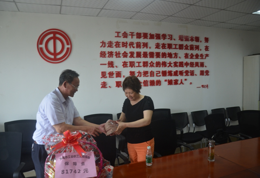 6月25日,市总工会调研员梅树华一行来到湾里区总工会,亲切慰问湾里区发改委患重病女职工,并送上互助保障慰问金81742.88元,以解职工燃眉之急。去年,湾里区发改委职工梅莉滨在省妇幼保健院检查中查出患有重大疾病,经过积极治疗身体有了好转。湾里区总工会了解情况后,经过申请,互保办事处核实后及时将这笔互助保障慰问金送到梅女士手中,第一时间送去工会组织对职工的温暖和关爱。