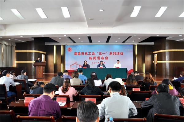 4月23日,南昌市总工会在市总25楼会议室举办“五一”系列活动新闻发布会。市总工会党组成员、副主席张小芳、邹循泷,市总工会党组成员、女职委主任熊艳出席发布会。