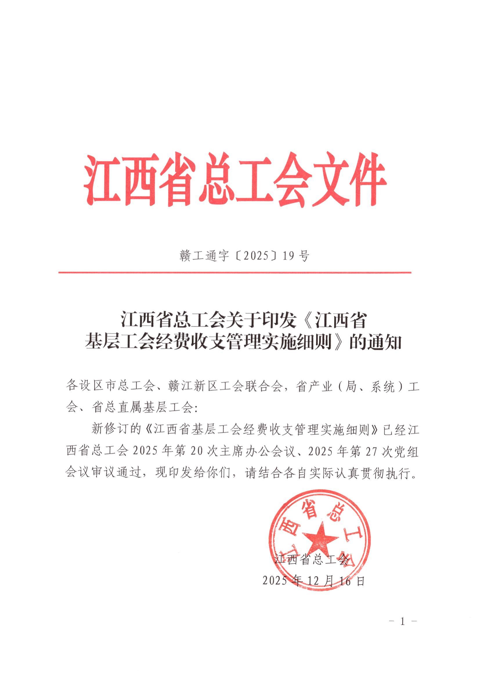 江西省总工会关于印发《江西省基层工会经费收支管理实施细则》的通知(赣工通字〔2025〕19号)